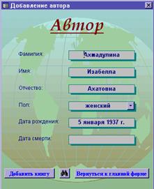 Открытие формы "Добавление автора" в режиме ввода данных.