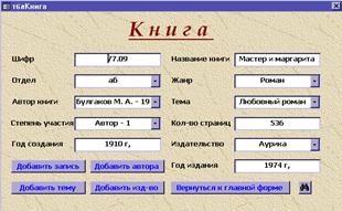 Форма изображена на рисунке А.3 (см Приложение А). Для добавления новой книги введите в соответствующие поля формы библиотечный шифр книги, название, год создания, год издания, количество страниц, а также выберете из выпадающих списков автора произведения, аббревиатуру отдела, где расположена книга, название издательства, жанр и тему произведения, степень участия автора в создании книги. Если требуемый автор, издательство, тема произведения отсутствуют в выпадающих списках, то, нажав соответствующую кнопку, их можно добавить в списки. После заполнения всех полей необходимо нажать на кнопку «Добавить запись». Кнопка «Вернуться к главной форме» закрывает текущую форму и открывает главную.