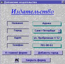 Форма изображена на рисунке А.4 (см Приложение А). Для добавления нового издательства введите в соответствующие поля формы его название, адрес по которому оно расположено, и телефон, а также выберете из выпадающего списка город, в котором находится издательство. Если требуемого города в списке нет, то вы можете добавить его, нажав кнопку «Добавить город». Кнопка «Закрыть форму» закрывает текущую форму, а кнопка «К главной форме» закрывает текущую и открывает главную форму.