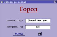 Форма изображена на рисунке А.5 (см Приложение А). Для добавления нового города введите в соответствующие поля формы его название и телефонный код и нажмите кнопку «Выход» для закрытия формы.