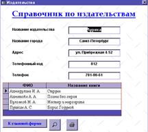 Для «Справочника по издательствам» - по одному значению для полей «Название издательства», «Город», «Адрес», «Телефонный код», «Номер телефона», а также список всех имеющихся в библиотеке книг, изданных этим издательством, с указание автора.