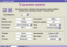 Форма изображена на рисунке А.8 (см Приложение А). Для удаления книги, с помощью кнопок перехода по записям, расположенных снизу, выберете нужную книгу и щелкните по кнопке "Удаление книги". Кнопка «Закрыть форму» закрывает текущую форму и открывает главную.