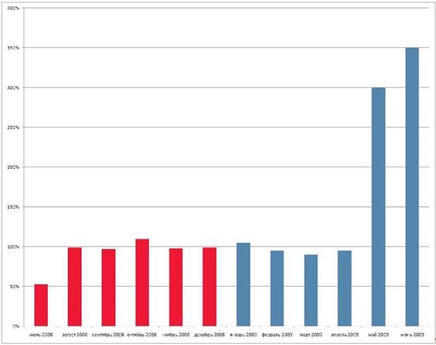 Рисунок 1 «Количество просмотров фишинговых страниц, помесячно по сравнению с январем 2009 г.»