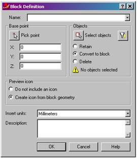 · Objects (Об'єкти). Цю опцію потрібно використовувати в тому випадку, коли ви тільки ще задумали створювати блок. У цьому варіанті стають доступними елементи керування, необхідні для добору об'єктів і задання базової точки (вони розміщені в зонах Objects і Base point ).