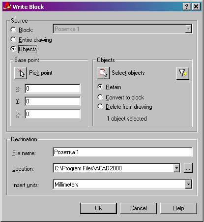 · Block (Блок). Якщо блок у кресленні вже був створений раніше і тепер залишається тільки зберегти його у виді окремого файлу, виберіть цю опцію.