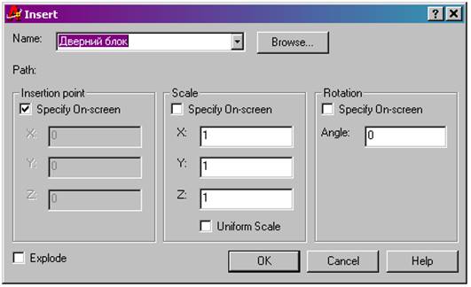 · Після подвійного кліка на піктограмі блоку AutoCAD відкриє діалогове вікно Insert . У цьому вікні, що досить докладно описано в попередньому розділі, можна чітко задати всі параметри вставки.