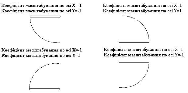 Від’ємний коефіцієнт масштабування для якої-небудь з осей задає дзеркальне відображення блоку або файлу. Якщо коефіцієнт масштабування від’ємний для осі X,то блок дзеркально відображається щодо осі Y. А якщо коефіцієнт від’ємний для осі Y, блок дзеркально відображається щодо осі X. На малюнку показані варіанти вставки дверного блоку з різними комбінаціями знаків коефіцієнтів масштабування по осях. Кут повороту для всіх блоків дорівнює 0°. Комбінуючи негативні і позитивні коефіцієнти масштабування і кути повороту, можна одержати необхідну конфігурацію дверей.