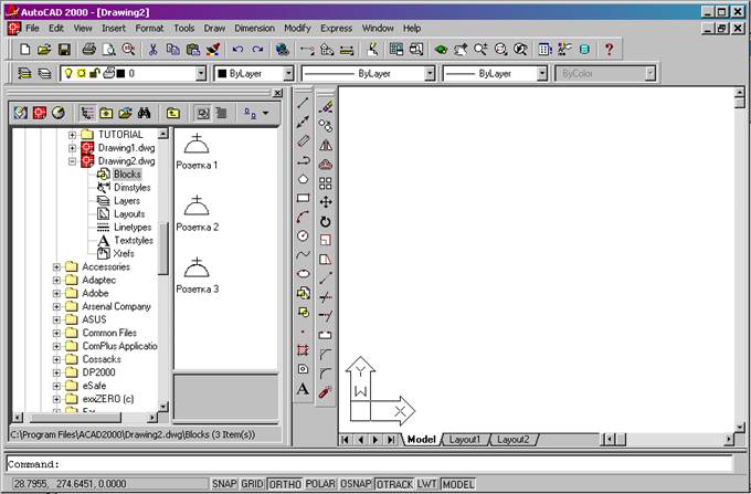 · Можна просто "затягти" піктограму блоку на поле креслення. У цьому випадку AutoCAD вставить блок у тій точці, де ви відпустите кнопку миші. Масштаб і кут повороту будуть такими, як AutoCAD пропонує за вмовчуванням.