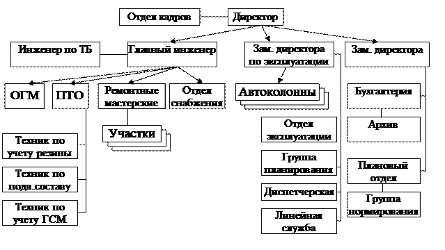 Данное АТП имеет линейную структуру управления производством, т.к. видно непосредственное подчинение каждому руководителю всех руководителей участка.