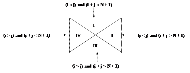 Относительно обеих диагоналей элемент массива может находиться в одной из четвертей.