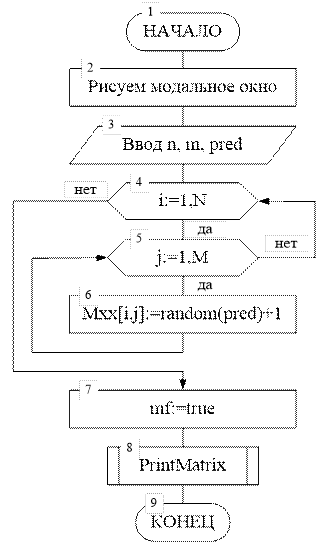 3 блок – вводим количество строк n, количество столбцов m и максимальное predзначение элемента матрицы, 4-6 блоки – вводим случайные элемента матрица, не превышая pred, 7 блок – устанавливаем флаг в true, т. е. матрица введена, 8 блок – выводим матрицу в окне программы.