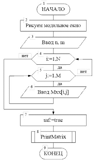 3 блок – вводим количество строк n, количество столбцов m, 4-6 блоки – вводим элементы матрицы, 7 блок – устанавливаем флаг в true, т. е. матрица введена, 8 блок – выводим матрицу в окне программы.