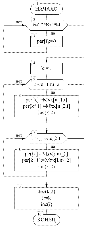 2, 3 блок – обнуляем значения элементов периметра, 4 блок – количество элементов в перимерте = 1, 5, 6 блоки – перебираем элементы столбца периметра и заносим в массив per, 7, 8 блоки – перебираем элементы строки периметра и заносим в массив per, 9 блок – заносим в переменную l количество элементов в периметре подматрицы.