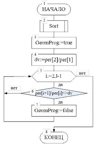 2 блок – вызов процедуры сортировки, 3 блок – флаг образования геометрической прогрессии, 4 блок – второе значение элемента массива периметра делим на первое, 5 блок – перебираем элементы массива периметра, 6 блок – следующее значение элемента массива делим на текущее и сравниваем с dv, 7 блок – не геометрическая прогрессия.