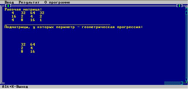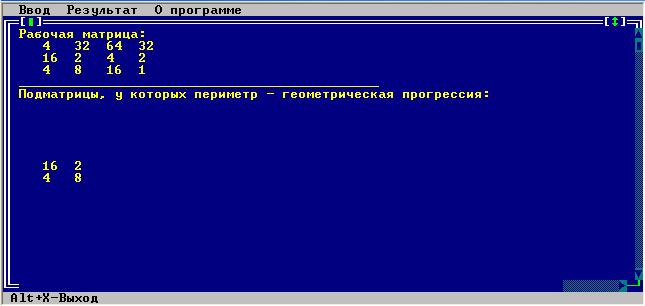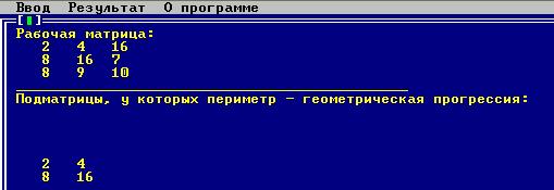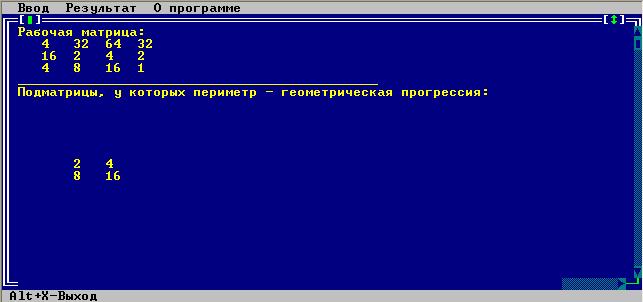 В результате выполнения курсовой работы был разработан программный продукт, который позволит выявить в прямоугольной матрице все подматрицы, по периметру которых расположены элементы, из которых можно образовать геометрическую прогрессию.