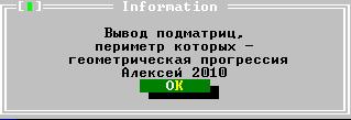 cmvhel:messagebox(#3'Вывод подматриц,'#13+#3'периметр которых -'#13+#3'геометрическая прогрессия'#13+ #3'Алексей 2010',nil,mfinformation or mfokbutton);