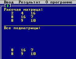 При нажатии клавиши Enter по кнопке с надписью «Все подматрицы», будут появляться все подматрицы рабочей матрицы в окне, нажимая любую кнопку клавиатуры (рисунок 17).