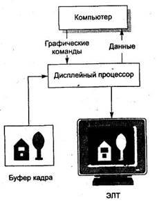 Графічний пристрій складається з дисплейного процесора, пристрою відображення, або дисплейного пристрою (монітор), і одного або декількох пристроїв вводу. Дисплей (монітор) представляє собою екран, на який виводиться графічне зображення, однак вивід конкретного зображення на екран виконується дисплейним процесором. Дисплейний процесор отримує сигнали, якими кодуються графічні команди, генеруючи електронні пучки і направляють їх в потрібне місце монітору, чим відтворює необхідне зображення.