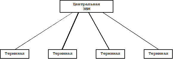 Принцип централизованной обработки данных (рис. 2) не отвечал высоким требованиям к надежности процесса обработки, затруднял развитие систем и не мог обеспечить необходимые временные параметры при диалоговой обработке данных в многопользовательском режиме. Кратковременный выход из строя центральной ЭВМ приводил к роковым последствиям для системы в целом, т. к. приходилось дублировать функции центральной ЭВМ, значительно увеличивая затраты на создание и эксплуатацию систем обработки данных.