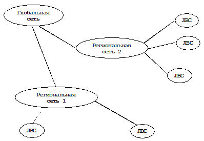 Объединение глобальных, региональных и локальных вычислительных сетей позволяет создавать многосетевые иерархии.Они обеспечивают мощные, экономически целесообразные средства обработки огромных информационных массивов и доступ к неограниченным информационным ресурсам.На рис. 5 приведена одна из возможных иерархий вычислительных сетей. Локальные вычислительные сети могут входить как компоненты в состав региональной сети, региональные сети – объединяться в составе глобальной сети и, наконец, глобальные сети могут также образовывать сложные структуры.