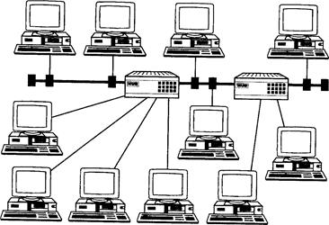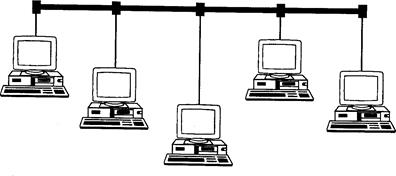 3.3.2.1. Шина. В этой топологии сеть состоит из единственного кабеля, к которому присоединены все компьютеры сети (рис. 9).
