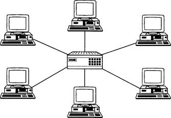 3.3.2.2. Звезда. В данной топологии все компьютеры соединены между собой через центральный концентратор (рис. 10).