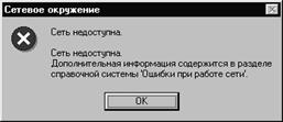 Если компьютер оснащен сетевой картой Ethernet,то после ее настройки (см. п. 2.4.3.3) на рабочем столе появляется специальная системная папка Сетевое окружение . Открыв ее двойным щелчком, получаем окно, представленное на рис. 12. Попытавшись открыть пиктограмму Вся сеть в этом окне, получим результат, показанный на рис. 13. Это говорит о том, что доступ к локальной сети отсутствует и причина этого, скорее всего, заключается в том, что рабочая станция не настроена для работы в сети.