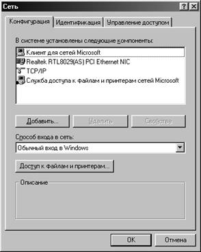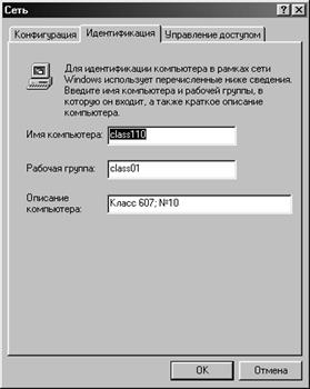 · на вкладке Идентификация окна Сеть (рис. 19) заполняют поля Имя компьютера , Рабочая группа и Описание компьютера. Имя компьютера – это сетевое имя ком-пьютера, то есть имя, под которым данная рабочая станция будет видна в сети. Рабочая группа – это объединение рабочих станций, относящихся к одному подразделению организации. Описание компьютера – это комментарий, который позволит определить принадлежность рабочей станции, если сетевое имя недостаточно информативно;