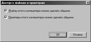 · в открывшемся окне Сеть (рис.14)на вкладке Конфигурация проверить, какие устройства и протоколы установлены на данной рабочей станции. Если компьютер из сетевых устройств имеет только сетевую карту[7] , то вкладка должна содержать одну строку, соответствующую этому устройству, одну строку, соответствующую протоколу TCP/IP, и строку, соответствующую программе-клиенту для работы в сети Microsoft. Кроме того, здесь может содержаться строка: Служба доступа к файлам и принтерам сетей Microsoft . Если этой строки нет, то нажимают кнопку Доступ к файлам и принтерам и в открывшемся окне (рис.15), устанавливают флажки, отвечающие за то, чтобы файлы и принтеры данной рабочей станции были доступны другим компьютерам в сети;