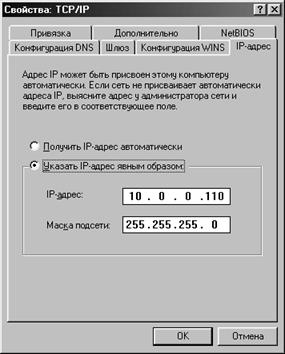 · для настройки сетевых адресов, выделяемых администратором сети , выделяют строку TCP / IP и нажимают кнопку Свойства . В открывшемся окне Свойства TCP / IP (рис. 16) имеется несколько вкладок. Если данная сеть не имеет сервера DHCP, автоматически выделяющего адреса рабочим станциям, то на вкладке IP -адрес (рис. 16) заполняют поля IP-адреса и маски подсети. Если адреса в сети выделяются автоматически, то необходимо установить соответствующий селектор;