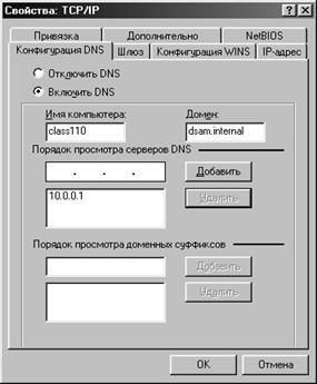 · на вкладке Конфигурация DNS (рис. 18) включают селектор Включить DNS , записывают имена рабочей станции и домена, распознаваемых сервером DNS, а также IP-адрес сервера DNS[9] и закрывают окно Свойства TCP / IP ;