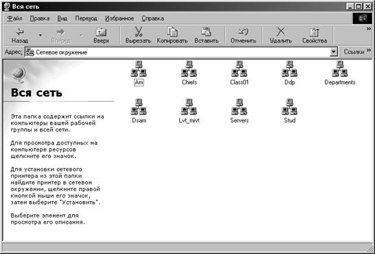 После перезагрузки компьютера открытая папка Сетевое окружение принимает вид, представленный на рис. 20а. Здесь показаны компьютеры, относящиеся к той же рабочей группе, что и данная рабочая станция, и имеющие ресурсы для общего использования в сети (диски, папки и принтеры). Открытие пиктограммы Вся сеть , позволяет увидеть все рабочие группы сети (рис. 20б) и получить к ним доступ.