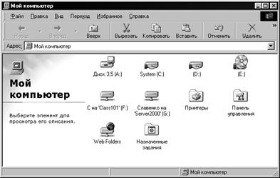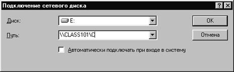 Вновь подключенный сетевой диск будет обозначен буквой, следующей за именем последнего дискового устройства локального компьютера. Например, если компьютер имеет устройство для чтения компакт-дисков CDROM, обозначенный буквой E : , то первый подключенный сетевой диск будет обозначен буквой F : , следующий G : и так далее (рис. 25).