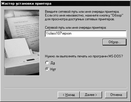 Если локальный компьютер не оснащен принтером, но имеются доступные принтеры в сети, то в процессе установки принтера (Пуск – Настройка – Принтеры – Установка принтера) необходимо в качестве способа подключения принтера к компьютеру выбрать селектор Сетевой принтер (рис. 26).