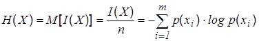 Энтропия – математическое ожидание H(x) случайной величины I(x) определенной на ансамбле {Х, р(х)} , т.е. она характеризует среднее значение количества информации, приходящееся на один символ.