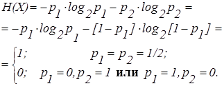 Найдем энтропию системы двух альтернативных событий с вероятностями p1 и p2 . Энтропия равна