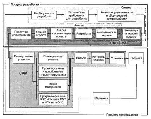 Выше мы описали типичный жизненный цикл продукта. Посмотрим теперь, каким образом на этапах этого цикла могут быть применены технологии CAD, САМ и САЕ. Как уже говорилось, компьютеры не могут широко использоваться в подпроцессе синтеза, поскольку они не обладают способностью хорошо обрабатывать качественную информацию. Однако даже на этом этапе разработчик может, например, при помощи коммерческих баз данных успешно собирать важную для анализа осуществимости информацию, а также пользоваться данными из каталогов.
