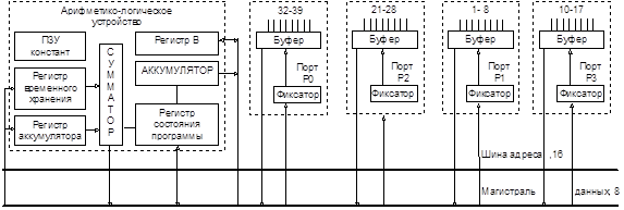 Логика ввода-вывода предназначена для приёма и выдачи сигналов, обеспечивающих обмен информацией ОМЭВМ с внешними устройствами через порты ввода-вывода Р0‑Р3.