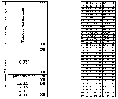 7. Пространство поразрядных прямых адресов внутренней памяти данных. Диапазон адресов этого пространства находится в пределах от 0 до 127. Данное пространство физически совпадает с пространством прямых адресов ячеек от 32 до 47. Пространство адресов триггеров специальных функций является продолжением пространства поразрядных прямых адресов;