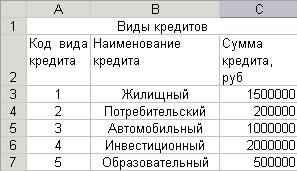 Рис. 1. Расположение таблицы «Виды кредитов» на рабочем листе Кредиты MSExcel