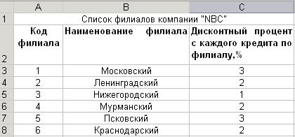 Рис. 2. Расположение таблицы «Список филиалов компании « NBC» на рабочем листе Филиалы MSExcel
