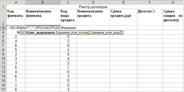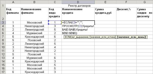 11. Заполним графу Наименование филиала таблицы «Реестр договоров» , находящейся на листе Договоры следующим образом: