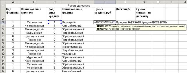 =ПРОСМОТР(C3;Кредиты!$A$3:$A$8;Кредиты!$C$3:$C$8).