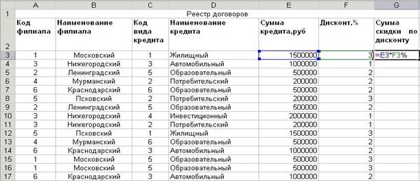 15. Заполним графу сумма по дисконту, руб., находящемся на листе Договоры следующим образом (рис.7)