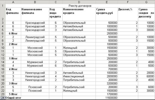 | Код филиала | Наименование филиала | Код кредита | Наименование кредита | Сумма кредита, руб. | дисконт, %. | Сумма скидки по дисконту, руб. |