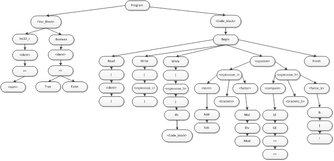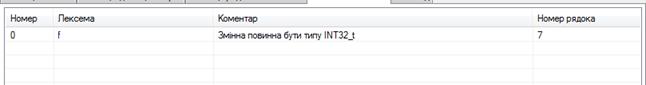 Суттю виявлення семантичних помилок є перевірка числових констант на відповідність типу INT32_t , тобто знаковому цілому числу з відповідним діапазоном значень і перевірку на коректність використання змінних INT32_t і BOOLEAN у цілочисельних і логічних виразах. Результат роботи семантичного аналізу наведений на рис. 9: