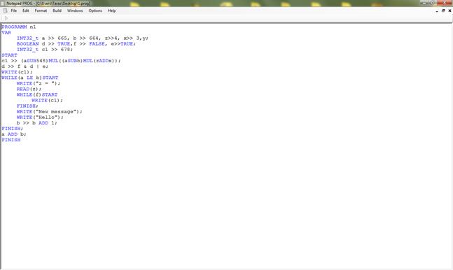 2.1.3. Розроблено генератор коду, який починає свою роботу під час коректного виявлення кожної конструкції і генерує код який відповідає кожній конструкції вхідної мови. Проміжним кодом генератора є програма на мові Assembler(i586). Вихідним кодом є машинний код, що міститься у виконуваному файлі