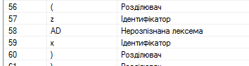 До помилок виявлених на етапі лексичного аналізу відносить тільки одна помилка – виявлення нерозпізнаної лексеми. Якщо було виявлено нерозпізнану лексему – в таблицю лексем заноситься поле з коментарем «нерозпізнана лексема», і їй присвоюється код -1, і на етапі синтаксичного аналізу буде згенерована помилка пов’язана з цією лексемою.Приклад виявлення нерозпізнаної наведений на рис. 7:
