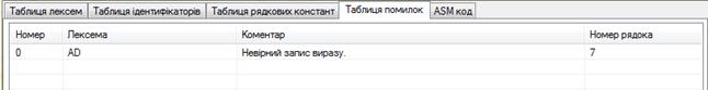 На етапі синтаксичного аналізу виявляється основна кількість помилок. Ці помилки пов’язані з невірними записами конструкцій вхідної мови. Всі помилки виявленні на етапі синтаксичного аналізу заносяться в таблицю помилок, Таблиця помилок містить лексему яка спричинила помилку, коментар і рядок в якому виникла помилка. Приклад таблиці помилок наведений на рис. 8: