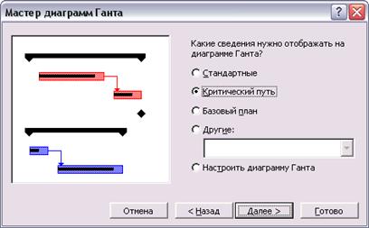 Для отображения критического пути проекта на диаграмме Ганта нужно воспользоваться мастером Gantt Chart Wizard (Мастер диаграмм Ганта), вызываемым одноименной командой в меню Format (Формат) или контекстном меню диаграммы Гаита. На втором шаге мастера нужно выбрать переключатель Critical Path (Критический путь) и нажать кнопку Finish (Готово).